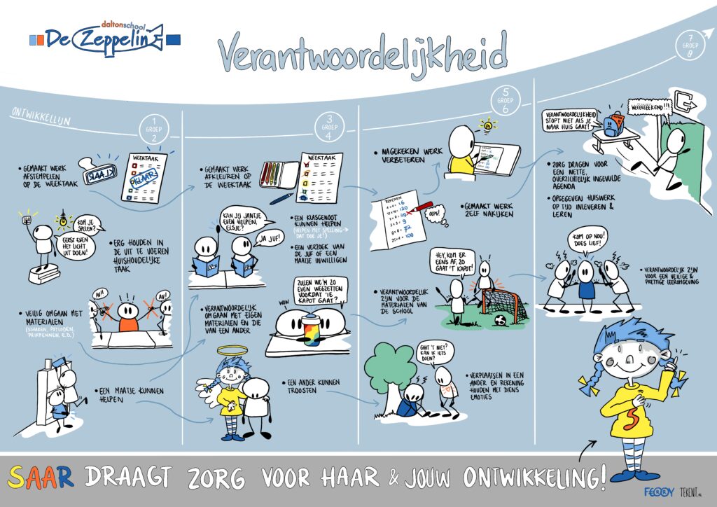 Op ODS De Zeppelin vinden wij het belangrijk dat een leerling leert verantwoordelijkheid voor zichzelf en zijn omgeving te dragen. Uitgangspunt is het vertrouwen in de eigen kracht van ieder kind. Daarom maken leerkracht en leerling samen afspraken over de leerstof. De leerkrachten bepalen in eerste instantie welke leerstof de leerling nodig heeft. De leerlingen schatten zelf in wat ze nodig hebben om een taak te kunnen doen en hoeveel tijd ze eraan willen besteden. Achteraf moet de leerling kunnen vertellen wat er goed is gegaan en wat het de volgende keer beter zou kunnen doen. De leerlingen leren stap voor stap met deze vrijheid om te gaan. Naarmate kinderen zich verder ontwikkelen, worden taken omvangrijker en complexer.
