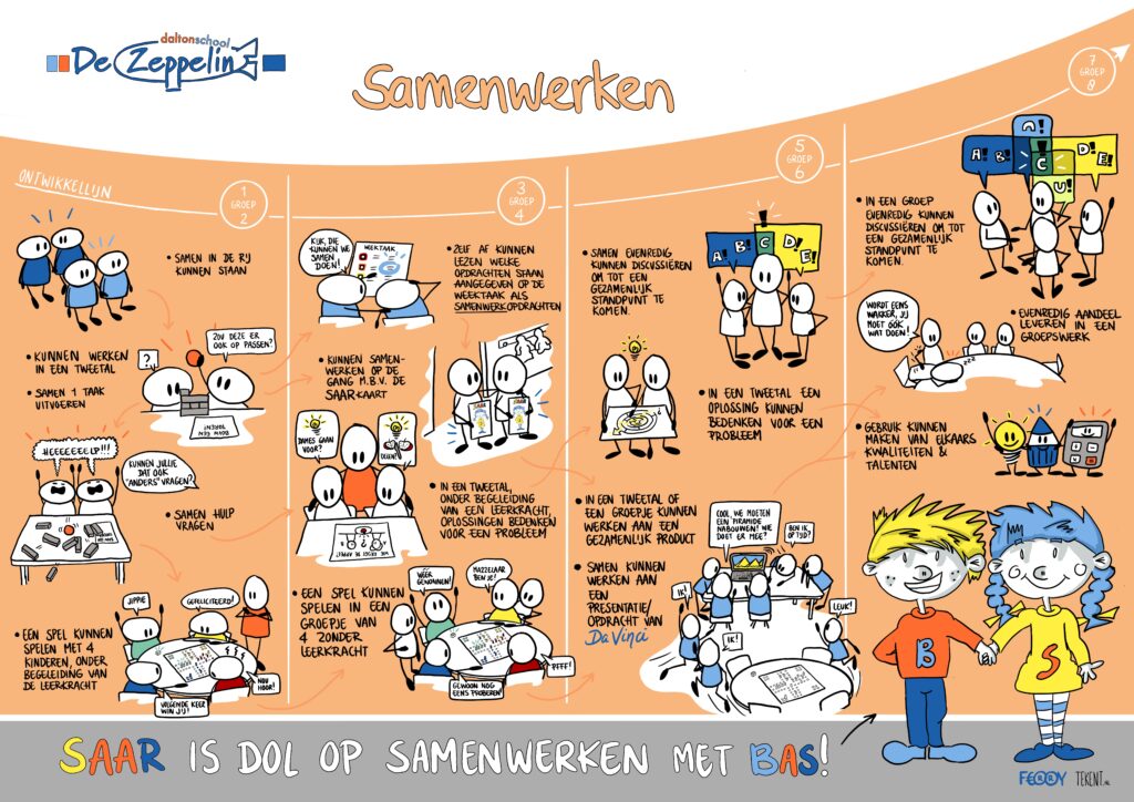 Om later als volwassene te kunnen deelnemen aan de samenleving, leren onze kinderen samen te werken. Daarom wordt op ODS De Zeppelin veel aandacht besteed aan het spelen en werken in groepjes en tweetallen. In de groepen werken de kinderen samen aan een les of opdracht. Ook werken wij groepsoverstijgend. Dit betekent dat we kinderen uit verschillende groepen laten samenwerken aan een opdracht (denk aan handvaardigheid, begrijpend lezen etc.). Al doende leren onze kinderen zo om te luisteren en respect te hebben voor elkaar.