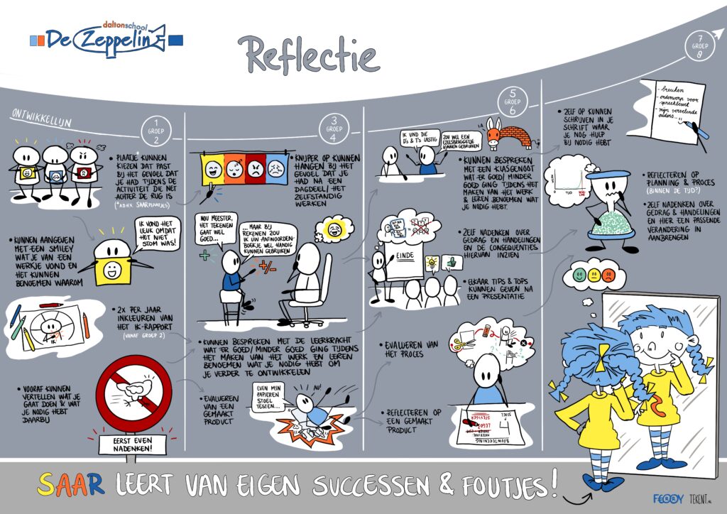 Nadenken over eigen gedrag en eigen werk vinden wij op ODS De Zeppelin erg belangrijk! Daarom reflecteren we regelmatig met de groep, maar reflecteren de kinderen ook op hun eigen leerproces door middel van de weektaak. Leerlingen leren vooraf een inschatting te maken van het eigen werk en gedrag. Achteraf evalueren de kinderen met de leerkracht hoe ze hebben gewerkt en wat het resultaat is. Door de evaluaties zijn de kinderen betrokken bij hun eigen leerproces en leren ze goed kijken naar zichzelf. Zo worden onze kinderen zich bewust van zichzelf (en hun gedrag) en ontwikkelen ze een kritische kijk op de wereld.